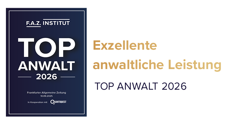 Aus rund 140.000 Anwälten in Deutschland wurde ich nach einer umfangreichen Recherchephase des F.A.Z. Instituts mit dem exklusiven Siegel „TOP Anwalt 2026“ ausgezeichnet. Nur etwa 1.200 bis 1.300 Anwälte deutschlandweit tragen diese Auszeichnung – ein Beweis für unsere herausragende Kompetenz und Professionalität. Ich biete eine erstklassige Beratung und Vertretung bei der immer die persönlichen Belange und Wünsche des Mandanten im Vordergrund stehen.